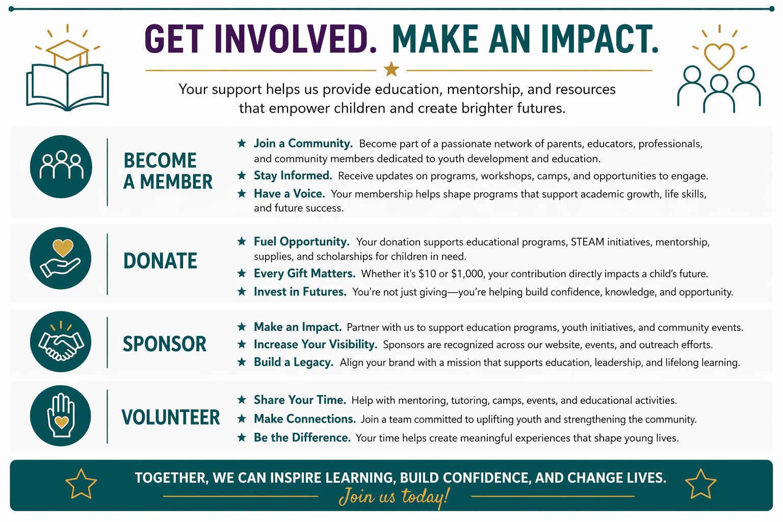 We believe every child deserves the opportunity to explore, create, and succeed through education—regardless of their background. As a nonprofit, our impact is only possible because of people like you. Whether you choose to become a member, make a donation, sponsor a program, or volunteer your time, you are directly helping us open doors for underprivileged youth in our community. Your support fuels hands-on learning, mentorship, and life-changing experiences that inspire the next generation of innovators. Join us in making a lasting difference—because together, we can build brighter futures.